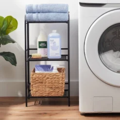 Organize your bath or cleaning essentials in sleek, simple style with the Folding 3 Shelves in Black from Brightroom™. This standing shelf for storage is set on a black metal frame for a modern look that works well in a variety of spaces and decor styles. Multiple open shelves provide enough space for your items and easy access to them. With the foldable design, this metal-frame shelf is easy to move and store when not in use.